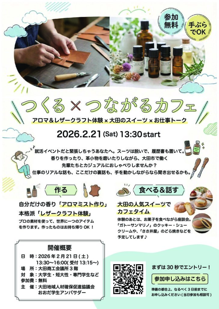 2月21日(土)に、大田商工会議所で「つくる×つながるカフェ」を開催します! アロマミスト作りやレザークラフト体験をしながら、大田市の企業の人とお話ししてみませんか? 社会人の先輩に仕事のリアルを聞けるチャンスです♪ 対象は大学生・短大生・専門... -